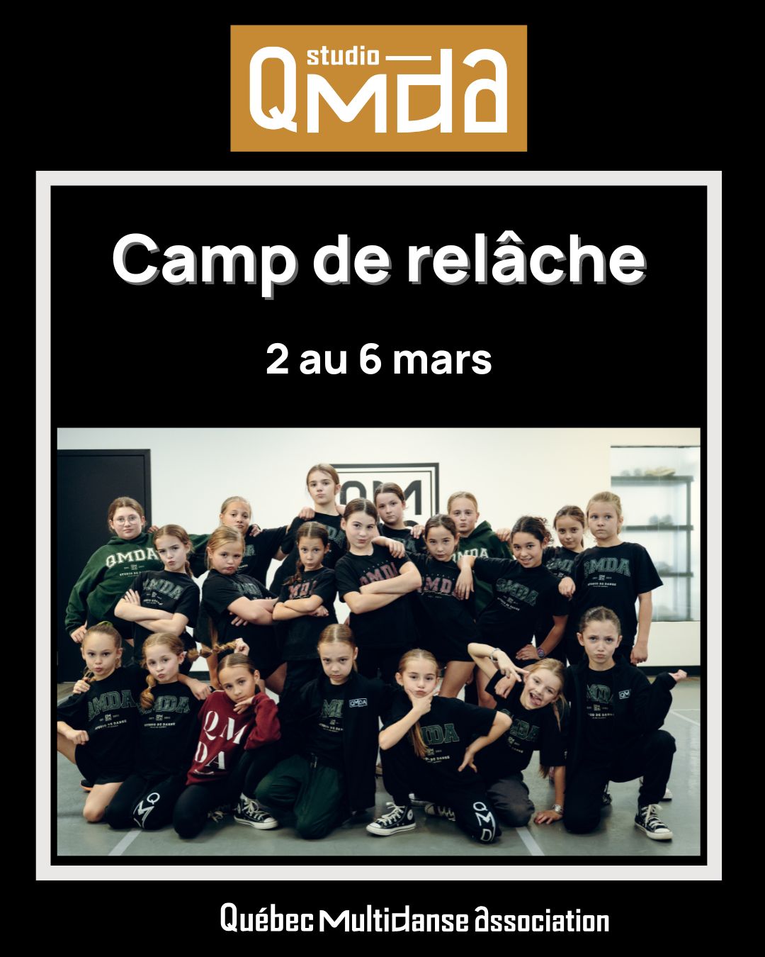 03 Jan Camp de la relâche 2026 Posted at 10:54h in Camp & formation, Nouvelles by Sylvain Le camp de la relâche QMDA se déroulera du 2 au 6 mars 2026. Viens danser et t'amuser avec nous ! Des chorégraphies seront enseignées dans plusieurs styles différents : Jazz... Read More